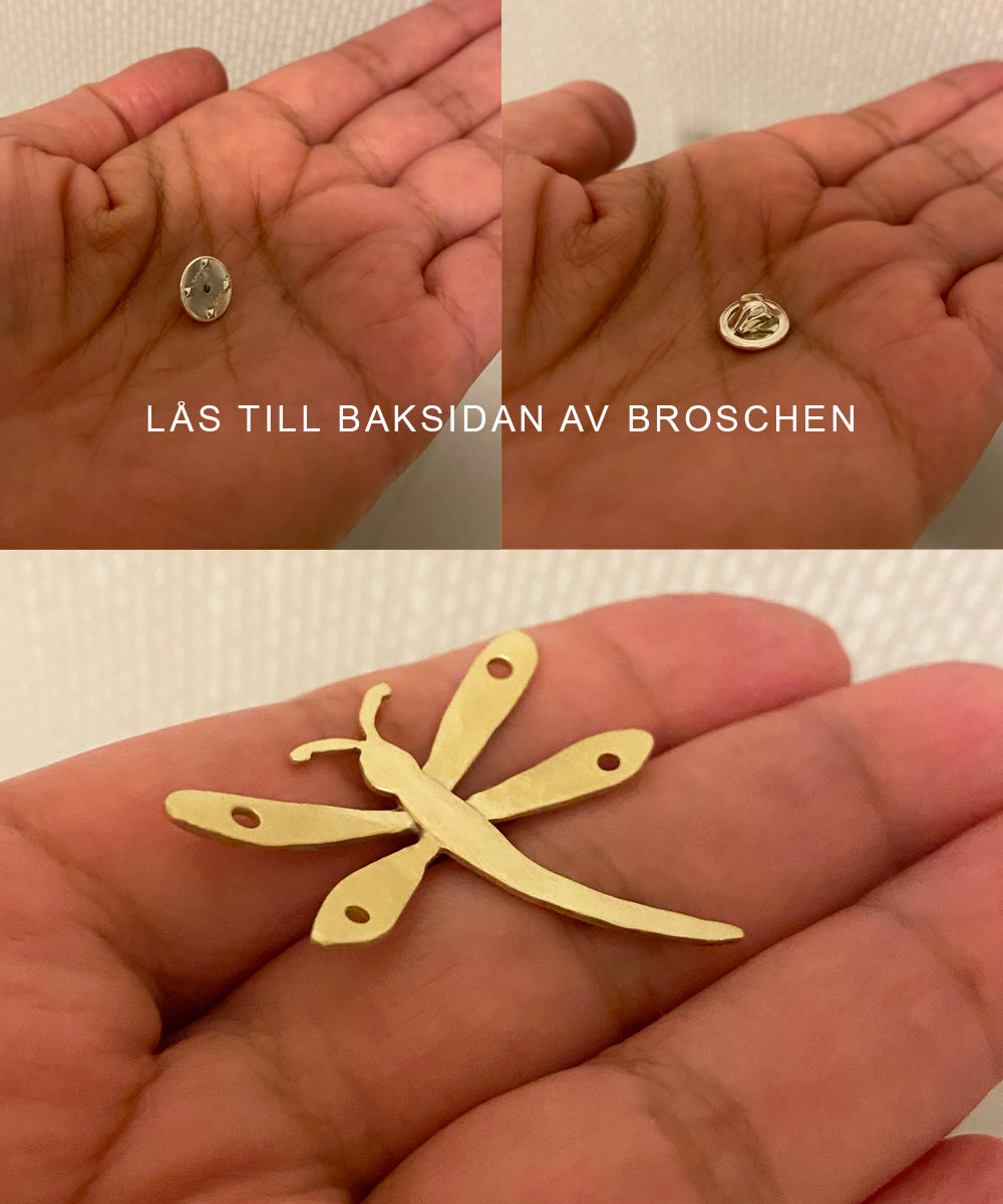 Denna förtjusande trollslända har jag designat och sågat av en mässingsplåt. Trollsländan är slipad och putsad. Baksidans fäste är i Sterling silver.
